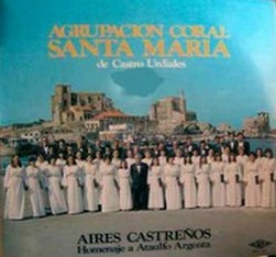 Aires Castreños (Homenaje a Ataulfo Argenta) Grabación realizada en el año 1982. La Agrupación Coral Santa María bajo la dirección de Teodoro Román Ribote, al presentar este su primer L.P., quiere rendir homenaje a su desaparecido paisano, el Insigne director de orquesta Ataulfo Argenta (1913-1958). Sucesores de aquella Schola Cantorum, Coro Parroquial, Coro Santa María, algunos de los coralistas en activo, recuerdan entre nosotros su estilizada figura y sobre todo, su sencilla personalidad, puesta de manifiesto tantas veces en una faceta musical que pocos (fuera de su Ciudad natal) conocían: Argenta cuando venia a Castro se integraba en el coro como uno más, cantando en la cuerda de tenores segundos, pues (según él) su voz “no daba para mas”. En recuerdo de esos momentos entrañables, sin olvidar aquellos en los que (al frente de las más prestigiosas formaciones musicales del mundo) nos hacía vibrar con su gesto inigualable, ofrecemos a su memoria estas canciones, que describen el alma del pueblo que tanto amó.